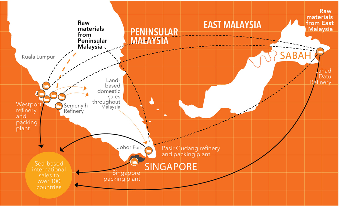 With current refining capacity of 3.5 million MT per annum, we are one of the largest palm oil processors in the world. We currently have four refineries in Malaysia, two packing plants in Malaysia and one packing plant in Singapore. Our refineries in Westport, Pasir Gudang and Sabah are situated near to ports that are located along major shipping routes and have pumping facilities that allow us to receive